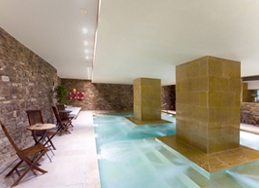 Zona SPA con Piscina dinámica con cascada y burbujas de agua, sauna seca, baño de vapor, jacuzzi colectivo, piscina exterior y solarium (según temporada): 15 €/ persona (se facilita albornoz, zapatillas y gorro).